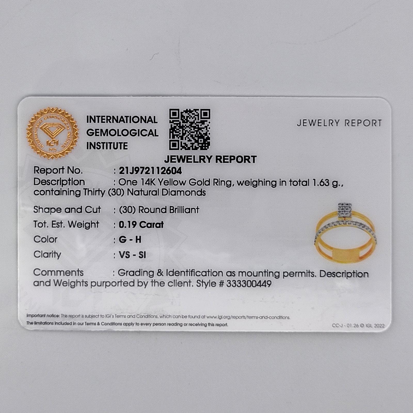 | Material | Gross WT: 1.63 |Diamond CTS:0.19 |Diamond PCS: 30 |Clarity / Color/: VS-SI / G-H |