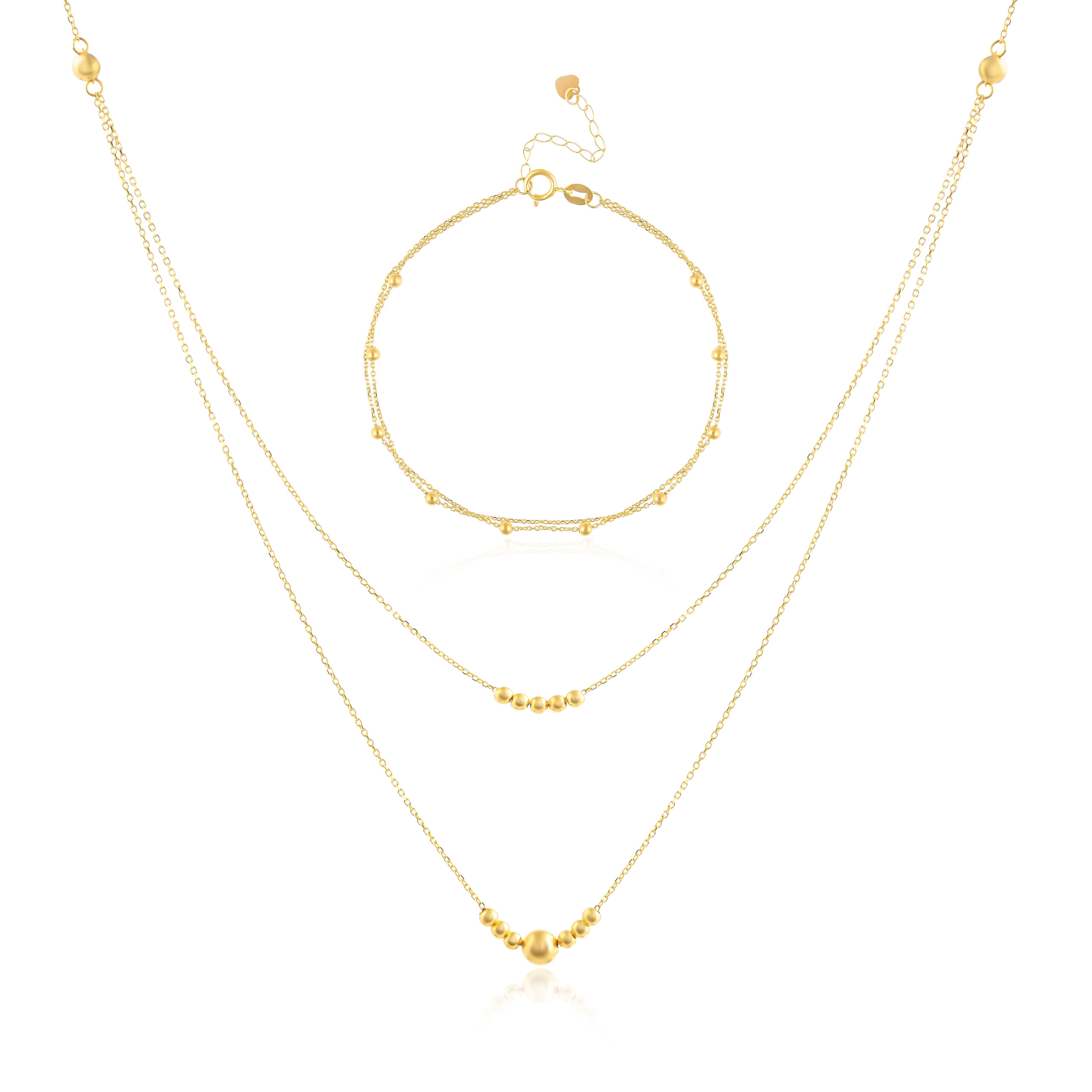 The necklace features intricate patterns that reflect traditional craftsmanship while maintaining a modern appeal. The bracelet complements it perfectly, adding a touch of sophistication to your wrist. Made from premium 21K gold, this set guarantees lasting shine and a luxurious feel.